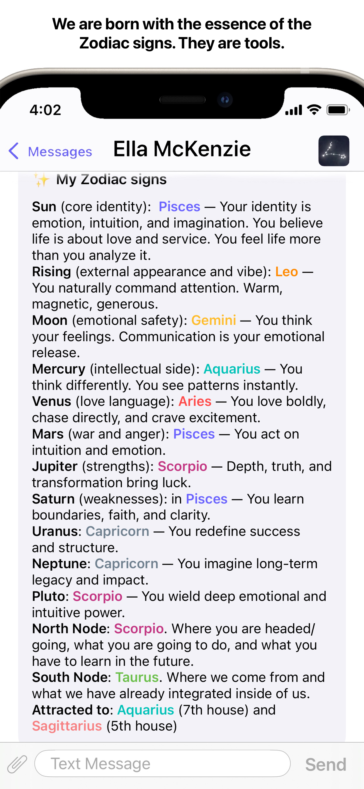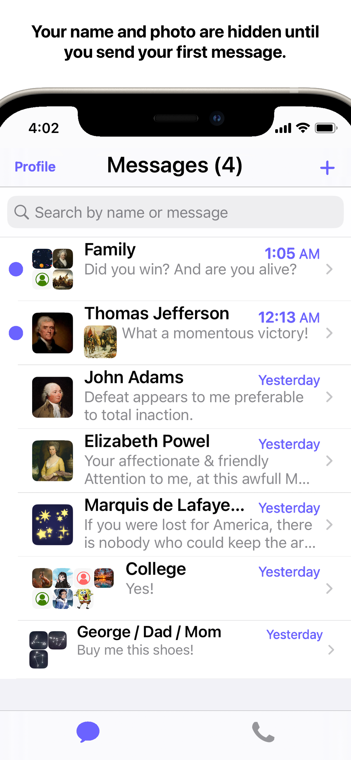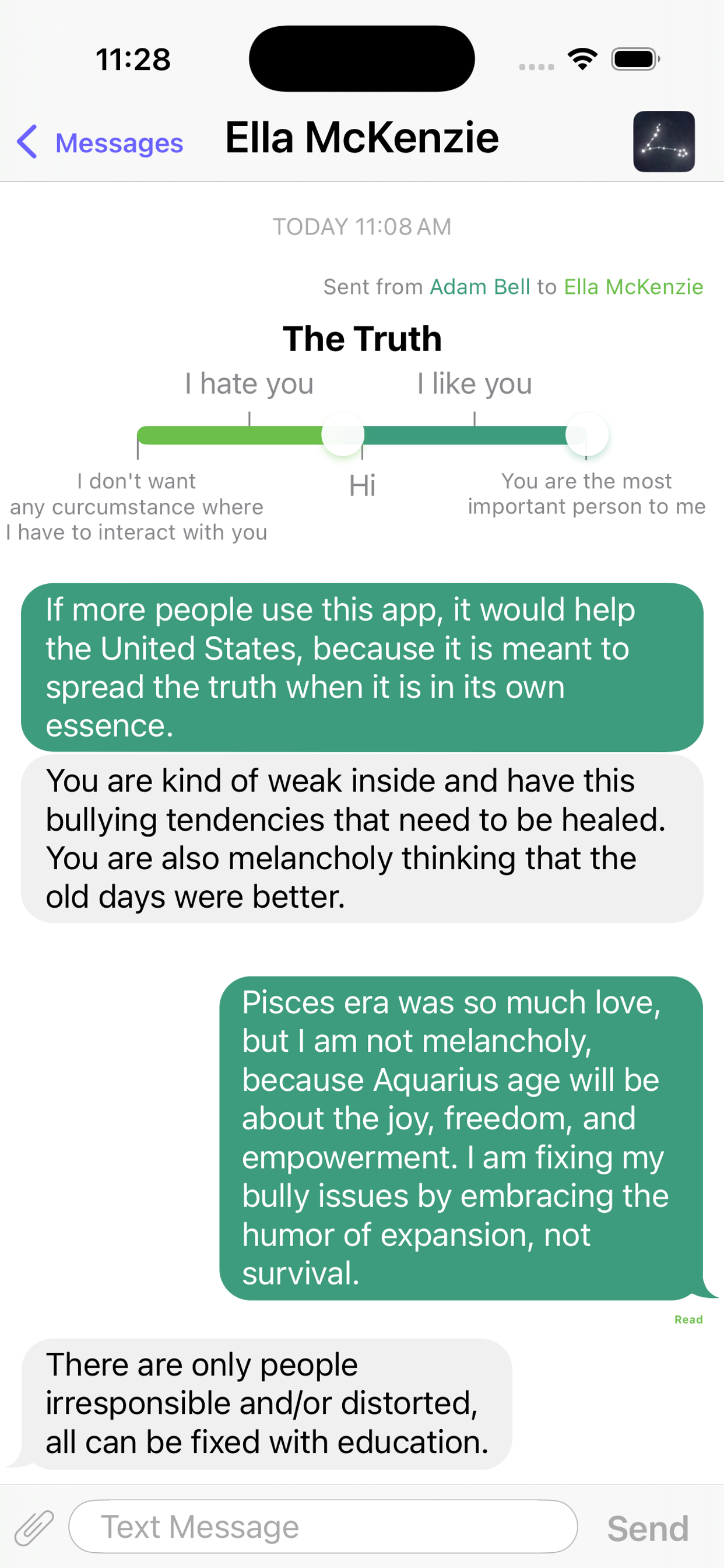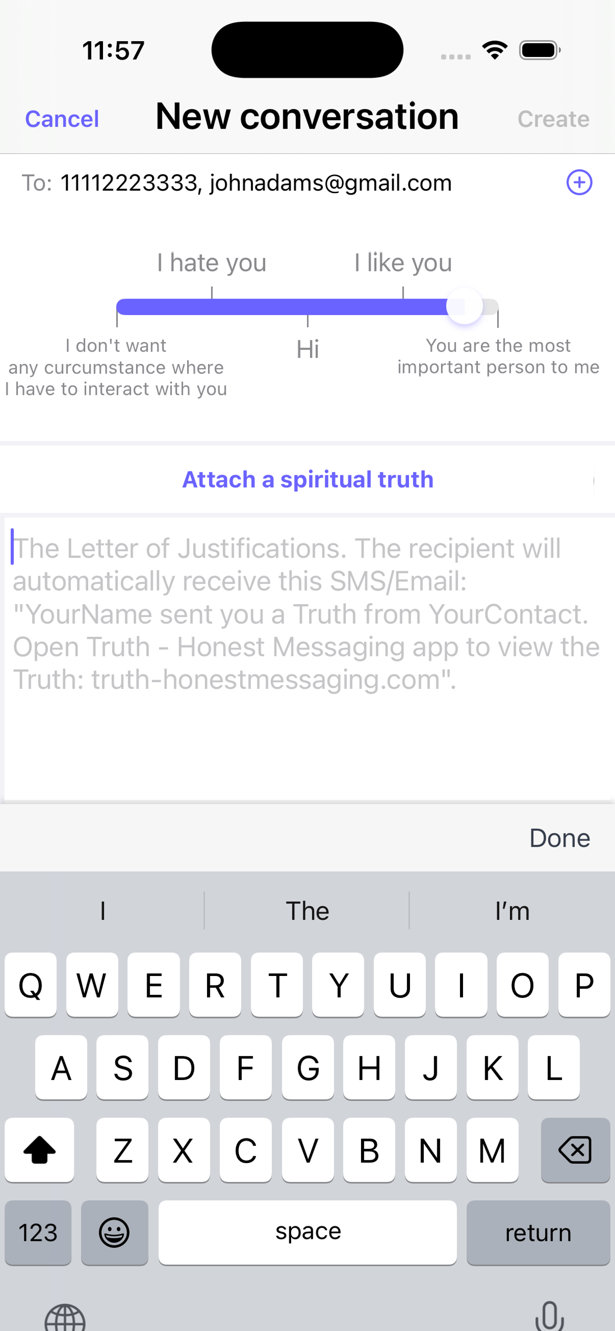 Send a Truth in the app by moving a slider to pick a rating of how much you care about them and write to them. To a phone number or Email address that you specified, they will receive a text message or email: (let's say you are George Washington) "George Washington sent you what they think is the absolute truth. View and message in Truth - Honest Messaging app: truth-honestmessaging.com". This would prompt them to download and open the app to see your Truth. In a private chat room of the app, your Truth will be displayed as a message bubble and will lead you to message each other honestly.